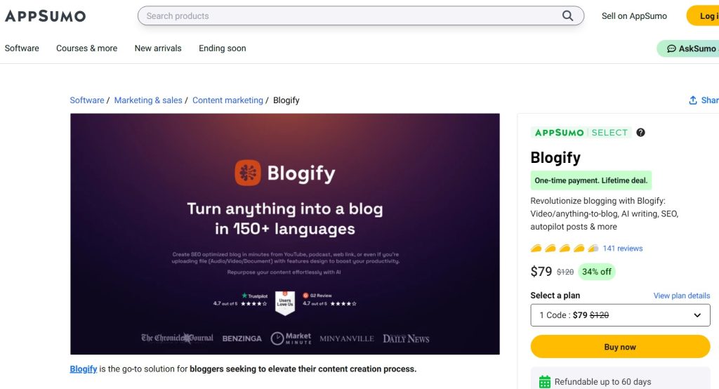 Each plan comes with a 60-day money-back guarantee, allowing you to try Blogify risk-free. For YouTube content creators, signing up for the Business plan before March 1, 2024, grants free integration.